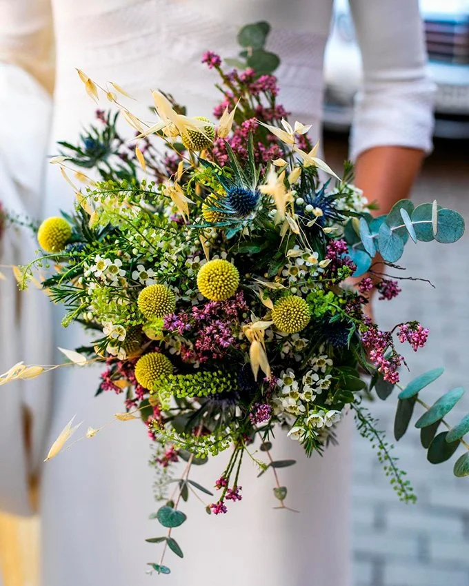 Los ramos silvestres se caracterizan por tener mucha vegetación suelta, bayas y llenos de flores grandes y pequeñas, pero de un aspecto agreste como las peonías, dalias, rosas austin, astilbe, serruria, achillea, rosa de pitiminí, brunias, eucalipto, ranunculus, alelí, tanacetum, etc. Los colores que podemos ver pueden ser desde neutros o se puede optar por una paleta de colores brillantes, tonos tierra, marfil, crema y mucha tonalidad verde.